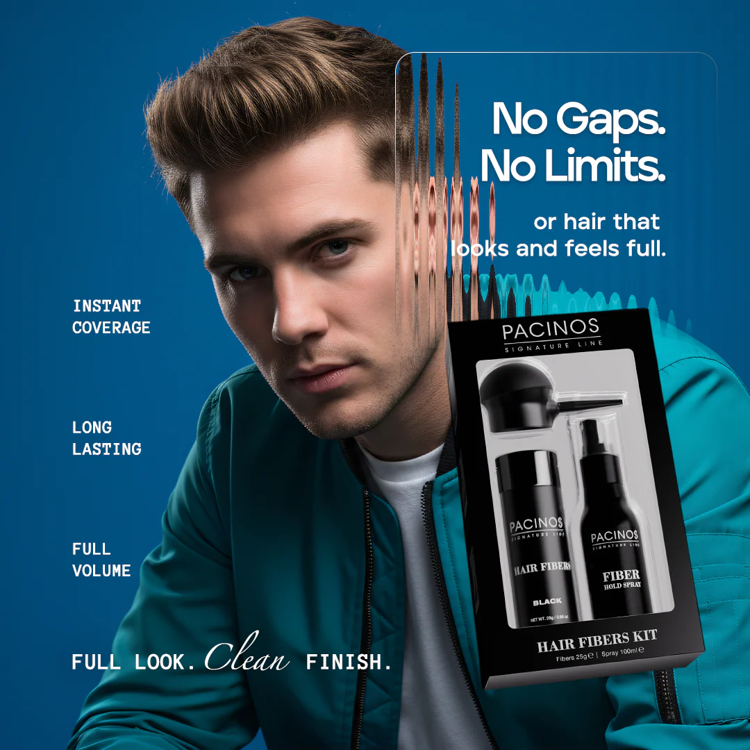 Pacinos Hair Fibers are a revolutionary hair loss solution that instantly conceals thinning hair and bald spots. These tiny, keratin-based fibers electrostatically bond to your existing hair, creating a natural, fuller appearance.
